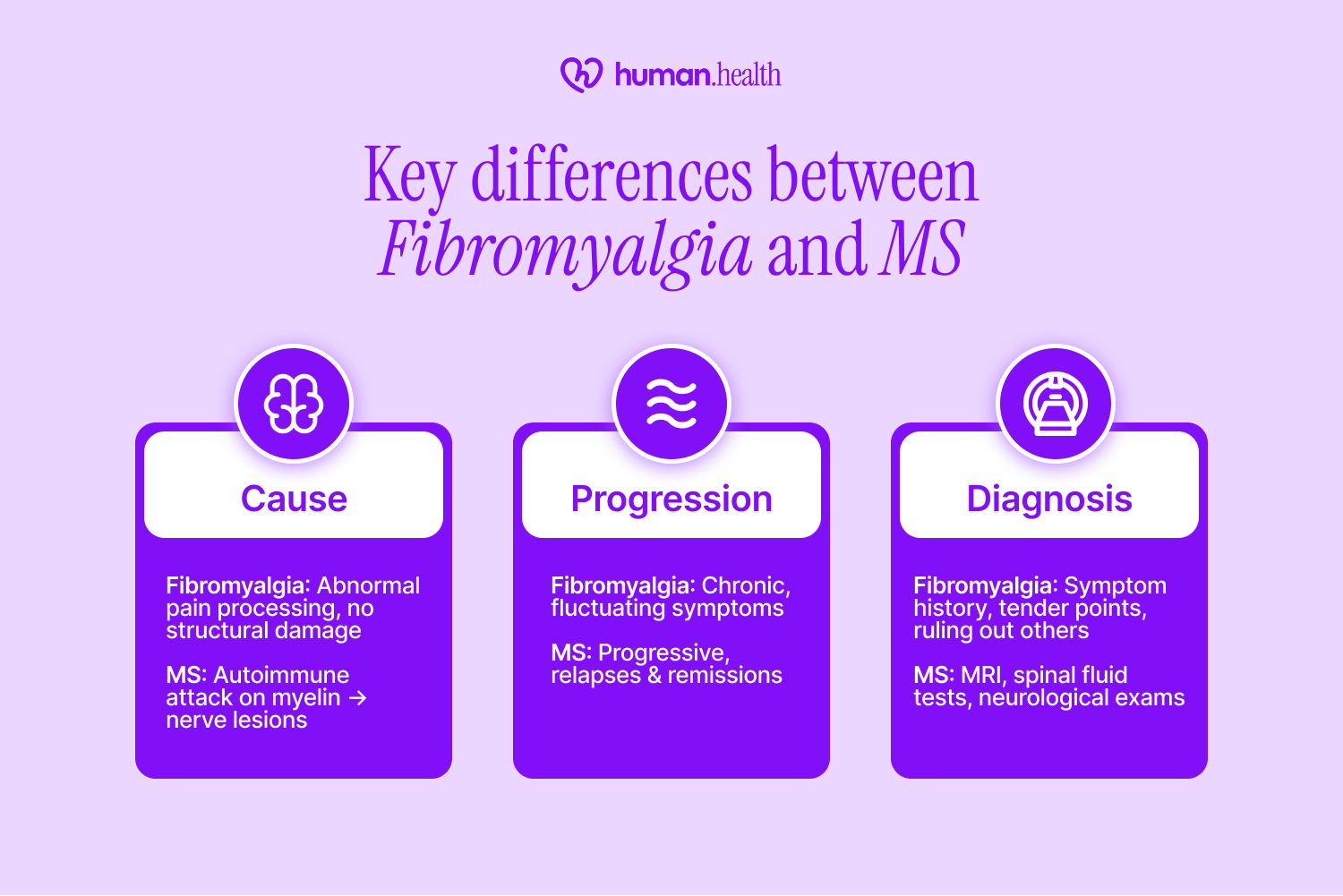 - Key differences include cause and progression: fibromyalgia has no known structural damage, whereas MS involves immune-driven nerve damage seen on scans.