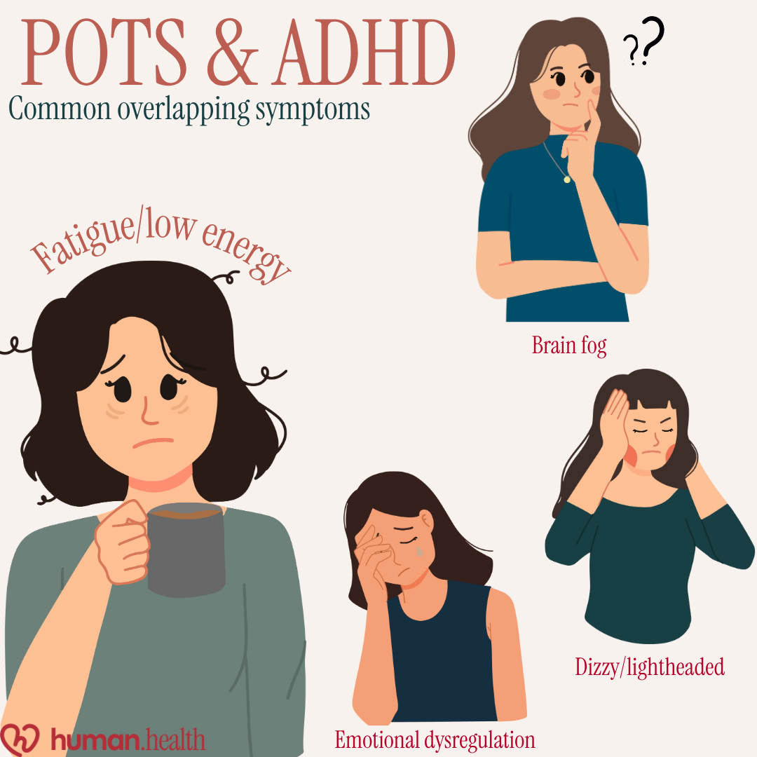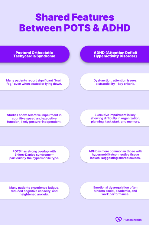 Studies suggest that people with POTS report higher rates of ADHD-like symptoms, but the overlap may also come from shared experiences like fatigue, brain fog, or poor sleep.