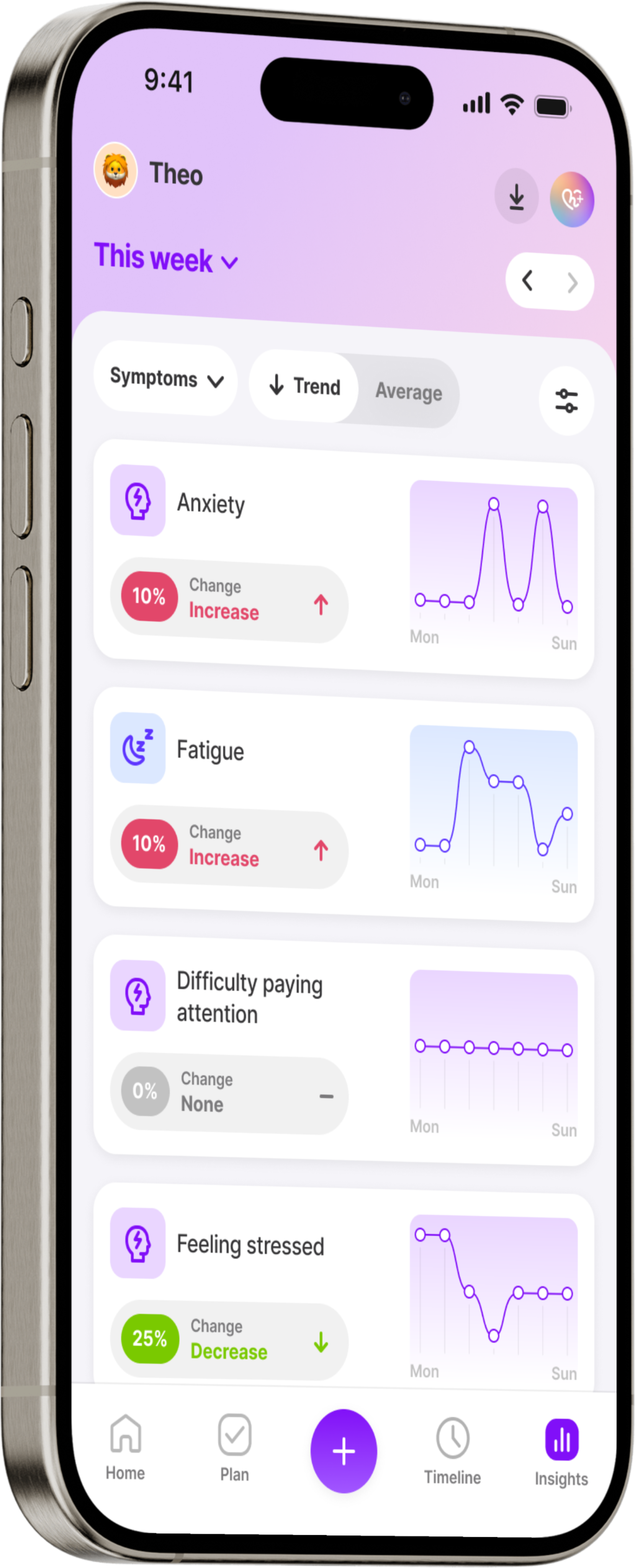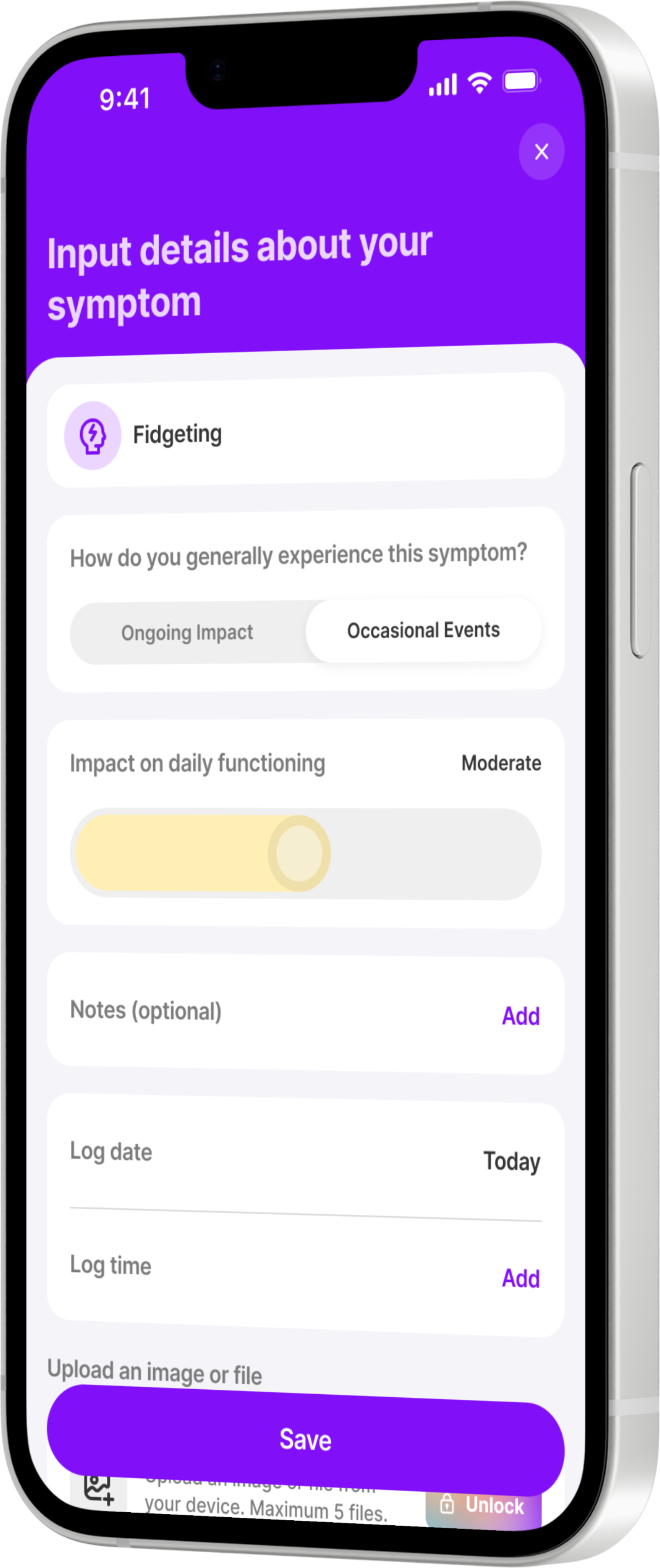 Use the tracker to log symptoms such as forgetfulness, hyperactivity, or focus challenges. You can also add custom entries to reflect your unique experiences.